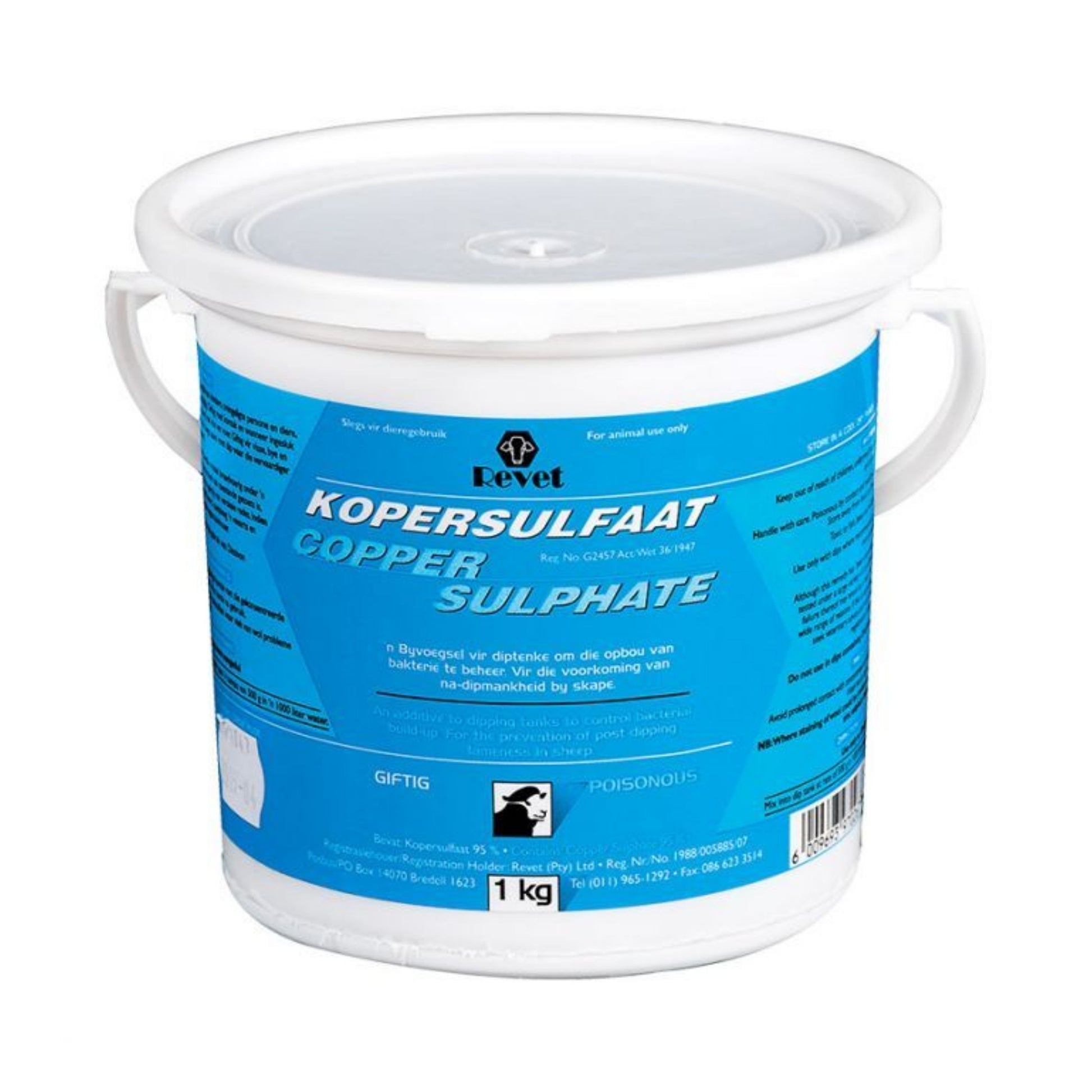 Revet Copper Sulphate is a trusted livestock health and hygiene solution, registered under Act 36/1947. Known for its effectiveness in dip tank management, this product helps maintain animal wellbeing and supports disease prevention on farms.